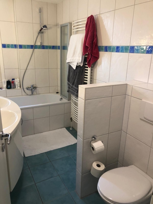 * Bad- TL: Wanne, Doppelwaschtisch, Handtuchheizkörper, WC.