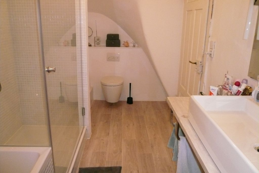 Im Obergeschoss befinden sich das Elternschlafzimmer mit angrenzender Ankleide und ein Kinderzimmer. Das Tageslichtbad wurde 2011 erneuert und umfasst ein großes Waschbecken, übergroße Wanne und übergroße Dusche, sowie ein WC. Ein Handtuchheizkörper, Spiegel (inkl. Vergrößerungsspiegel), eingebautes Regal runden das Bild ab. Als Bodenbelag wurde ein hochwertiger und unempfindlicher Linoleum verwendet.