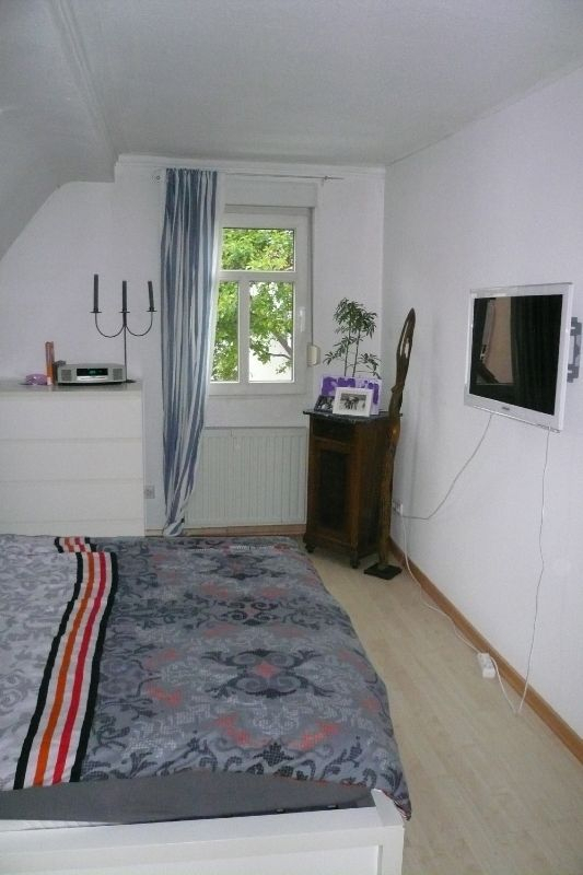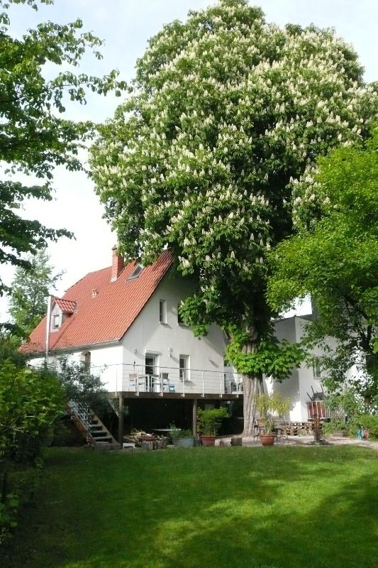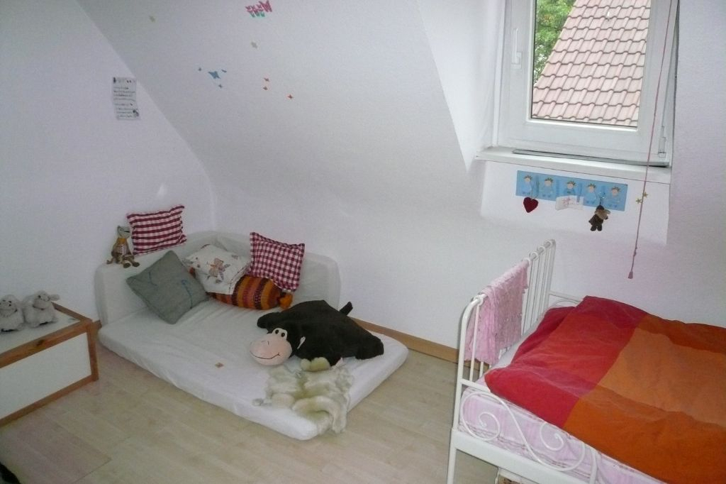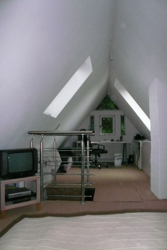 Der Spitzboden wurde als Wohnraum ausgebaut. Von hier aus hat man einen herrlichen Blick in den Garten und auf einen alten unter Naturschutz stehenden Baum. Man hat das Gefühl als sitze man in einem Baumhaus.