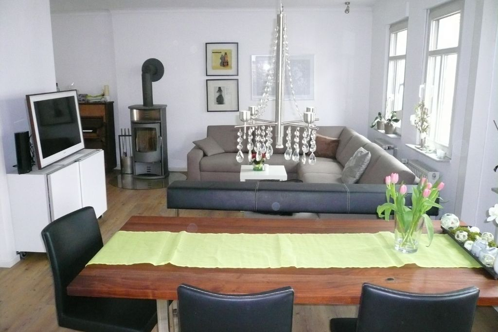 Im Erdgeschoss befinden sich der große Wohn-Essbereich, offene Küche mit Bartheke und ein Gäste-WC. Ein Kaminofen im Wohnbereich sorgt für Wärme und Gemütlichkeit.