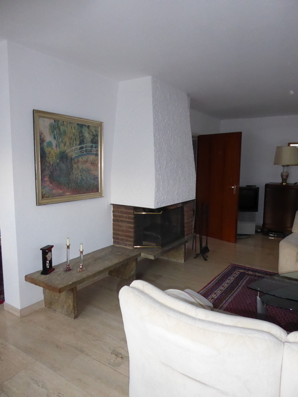 Hochparterre gelegen:+ Großzügiger Eingangsbereich, Wohnbereich mit Kamin und Zugang zum Balkon und Esszimmer sind mit hochwertigem Steinboden ausgestattet.