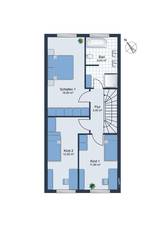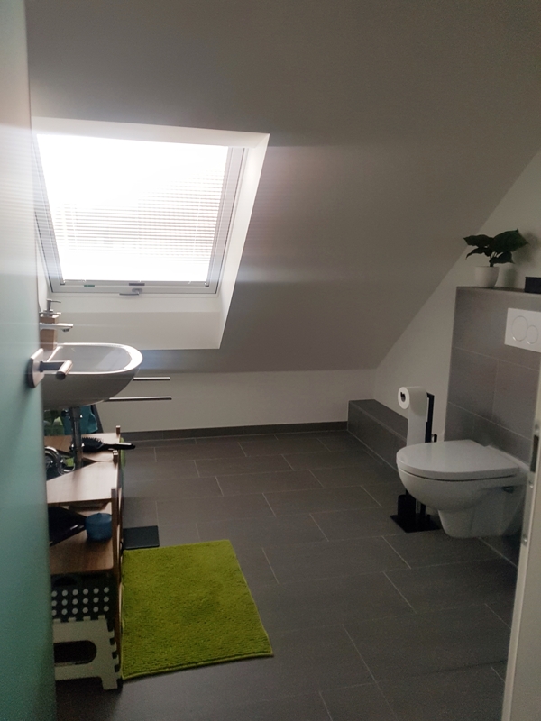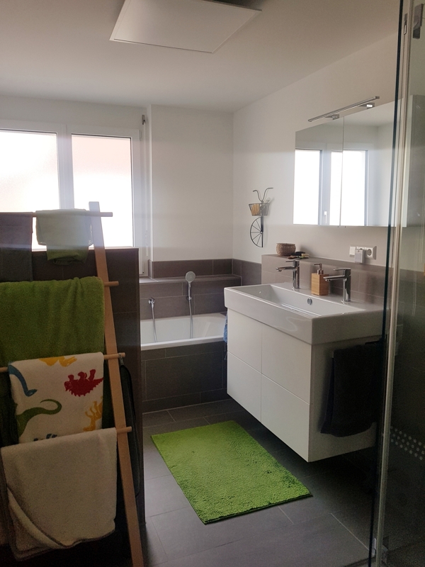 Tageslichtbad mit Badewanne, Dusche, Doppelwaschtisch und WC