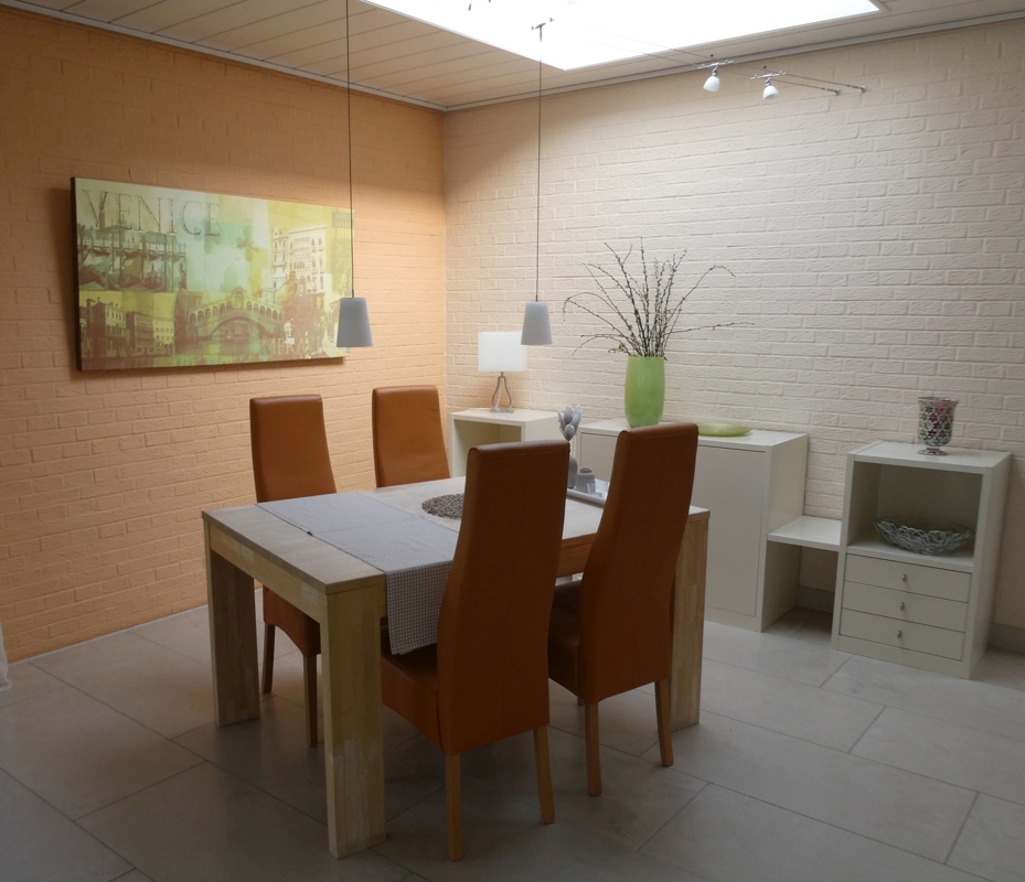 EG+ Wohn-/Essbereich mit hellen Steinzeugfliesen, FB-Heizung und Kamin