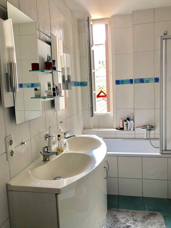 * Bad- TL: Wanne, Doppelwaschtisch, Handtuchheizkörper, WC.