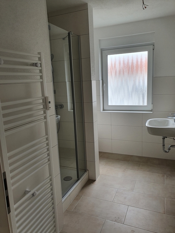 + TL-Badezimmer Fliesenboden mit Dusche, Waschbecken und WC
