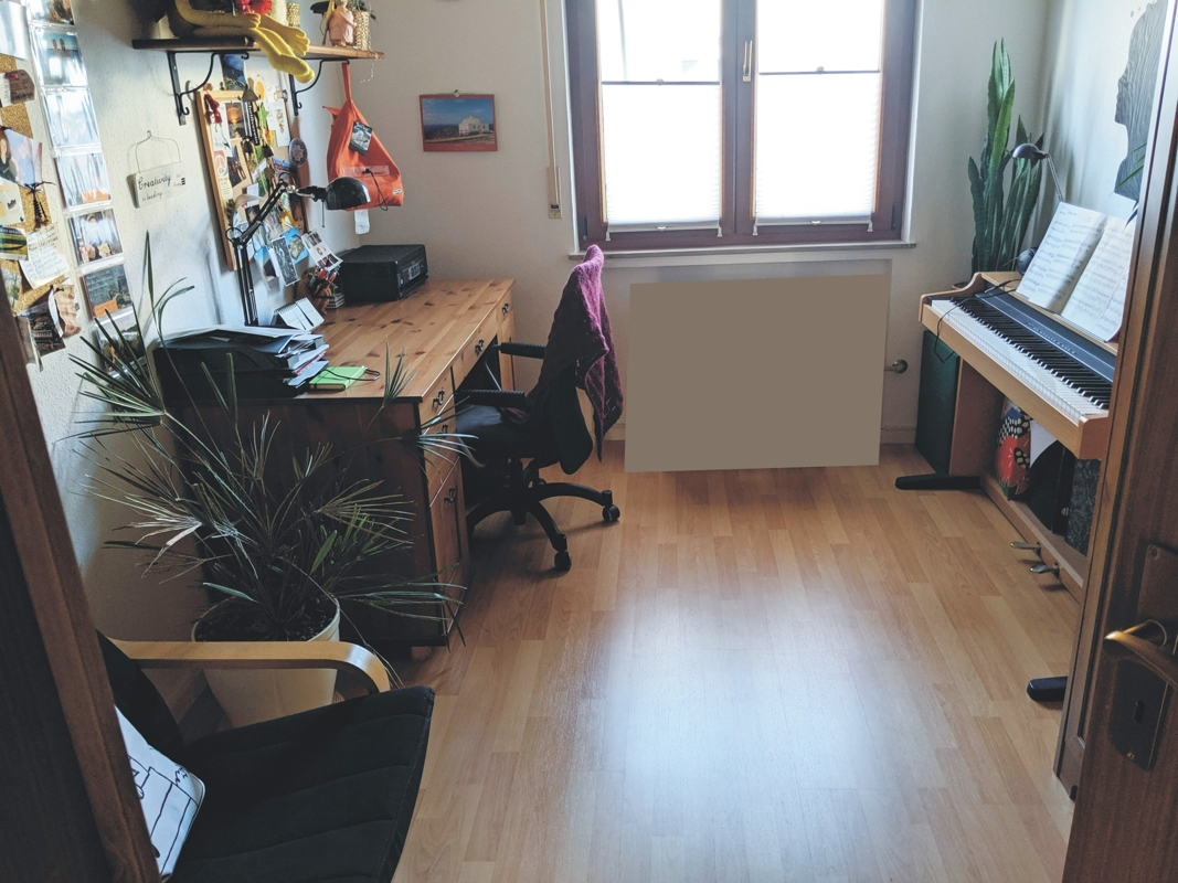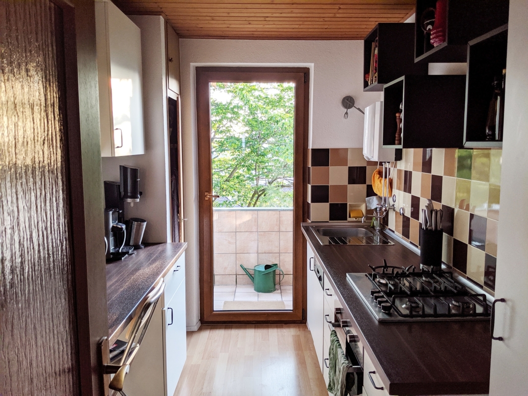 Die Böden vom Wohnzimmer, Bürozimmer, Schlafzimmer, Flur und Küche sind mit Laminat verlegt. Die Decken sind Holzdecken. Die Wohnung hat neuwertige Kunststoff-Fenster. Das Tageslichtbad ist mit einer Wanne mit Duschabtrennung und einem WC ausgestattet. Die Einbauküche kann von der Vormieterin übernommen werden. Extra TV-Anschluß im Bürozimmer. Vom Schlafzimmer und der Küche gelangt man auf den Balkon mit Blick ins Grüne und zum großen schönen Gemeinschaftsgarten. (wird von einer Gartenfirma gepflegt). Zur Wohnung gehören 2 Kellerräume. Der Waschmaschinenraum ist gemeinschaftlich, ebenso der Fahrradraum.Sonstige Angaben: