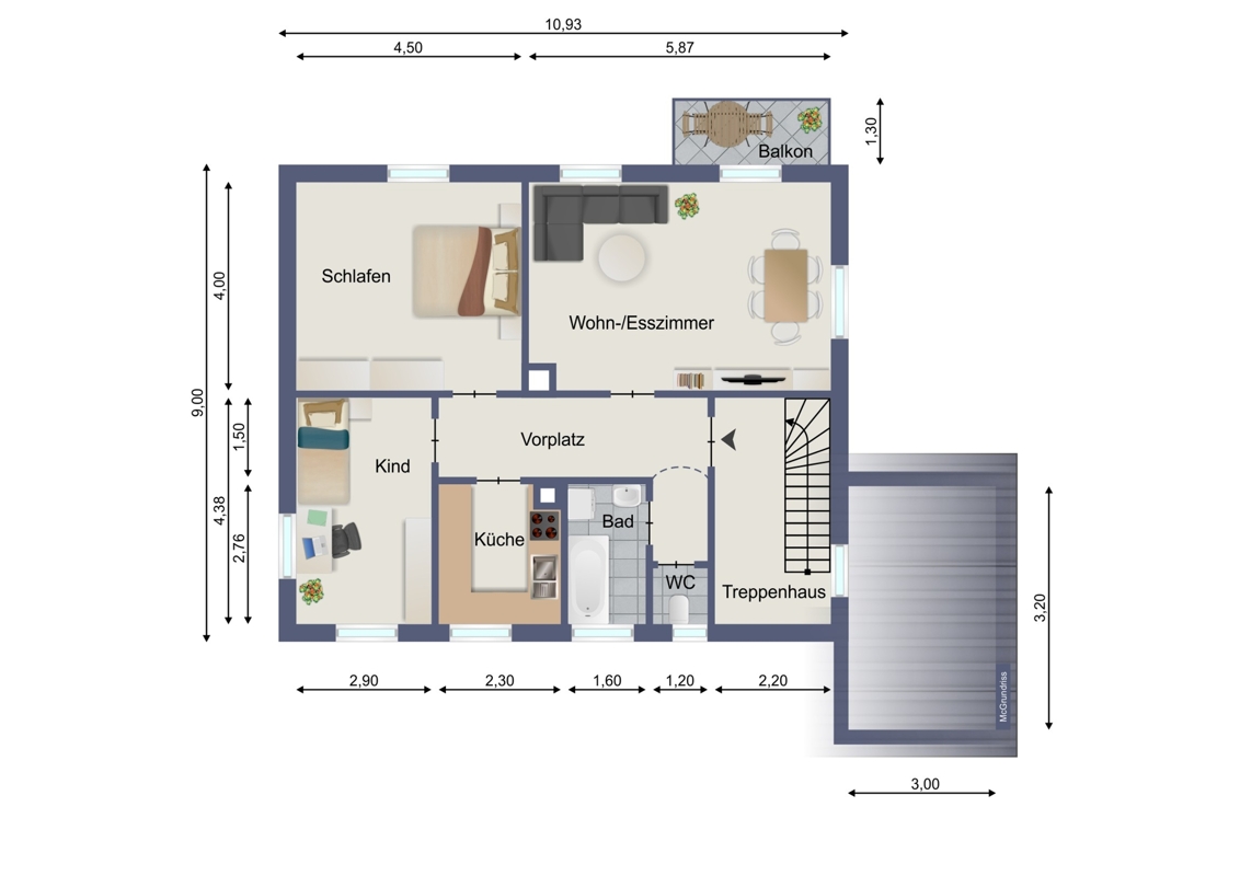 Obergeschoss: 3-Zimmer, ca.73 m², 1 Balkon.