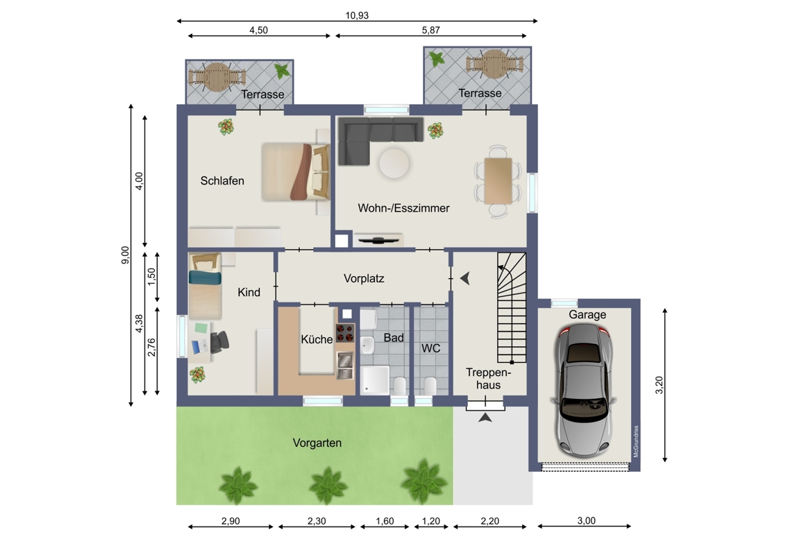 Zum Haus gehört ein Garten und eine Garage (im Kaufpreis inbegriffen).