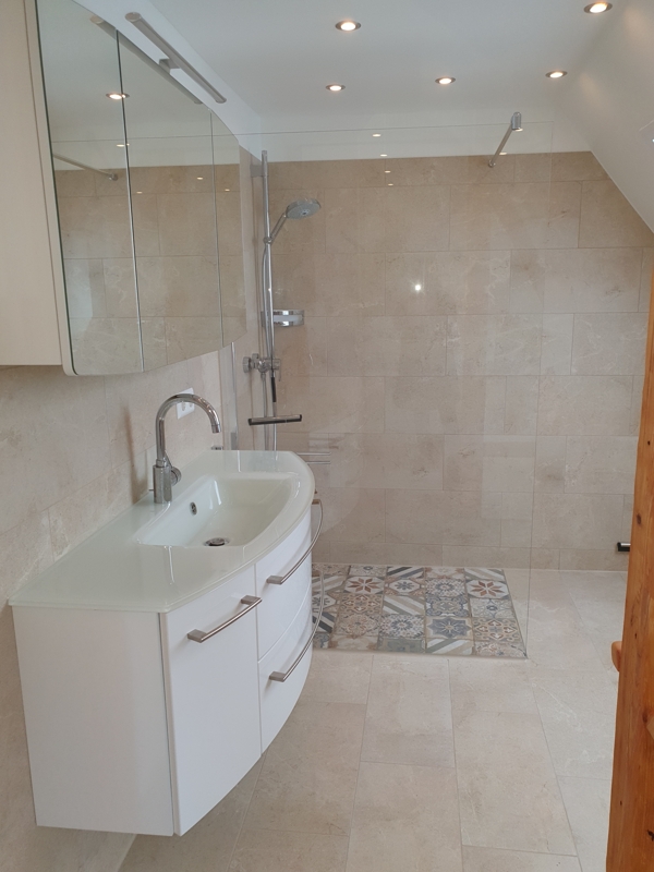 + TL Bad mit Badewanne, bodentiefer Dusche, Waschtisch und Spiegelschrank komplett gefliest.