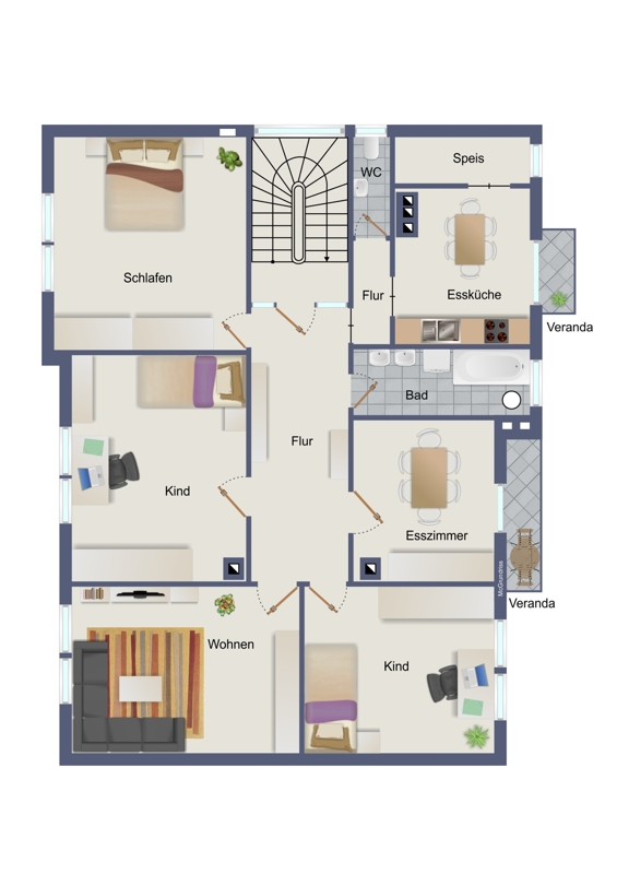 Die Wohnung hat Parkettböden. Das Tageslichtbad verfügt über eine Wanne, 2 Waschbecken und einen Waschmaschinenstellplatz. Das WC mit Fenster ist separat. Sehr praktisch ist die gemütliche Essküche mit "Speisekammer". Die 5 zur Verfügung stehenden Räumen können individuell verwendet werden. Die Wohnung hat 2 Balkone.