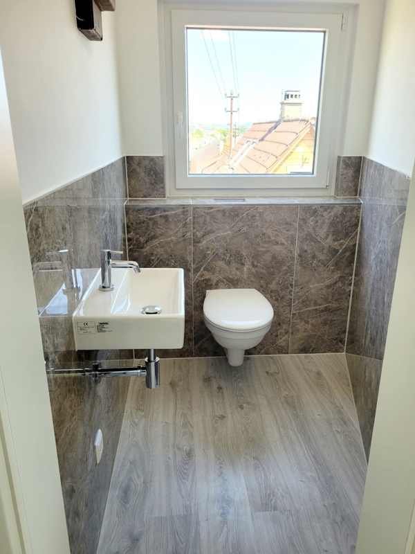 Die Böden sind mit Laminat ausgestattet. Das Bad und WC sind gefliest.