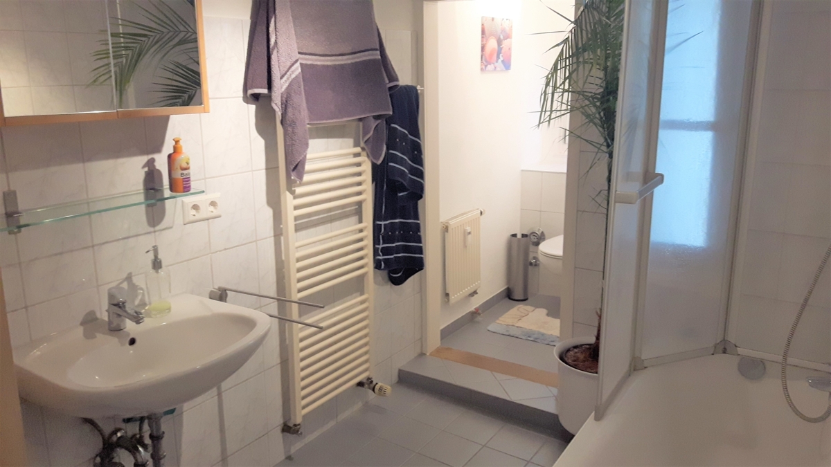 Tageslichtbad gefliest mit Wanne, WC und Waschbecken.