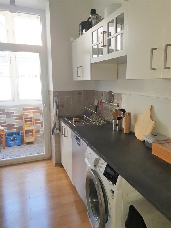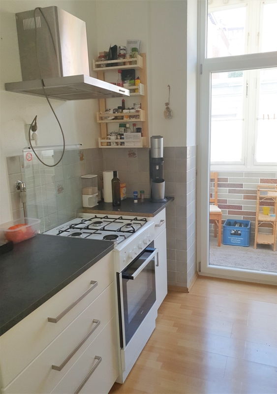+ Küche mit Laminatboden. Die EBK mit Spüle, Spülmaschine, Kühlschrank, Herd und Waschmaschine muss vom Vormieter übernommen werden. Zugang zur Veranda.