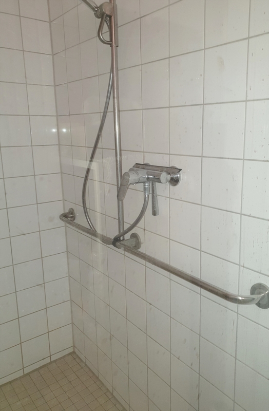 + Tageslicht-Badezimmer weiß gefliest mit großer Dusche, Waschbecken und WC.