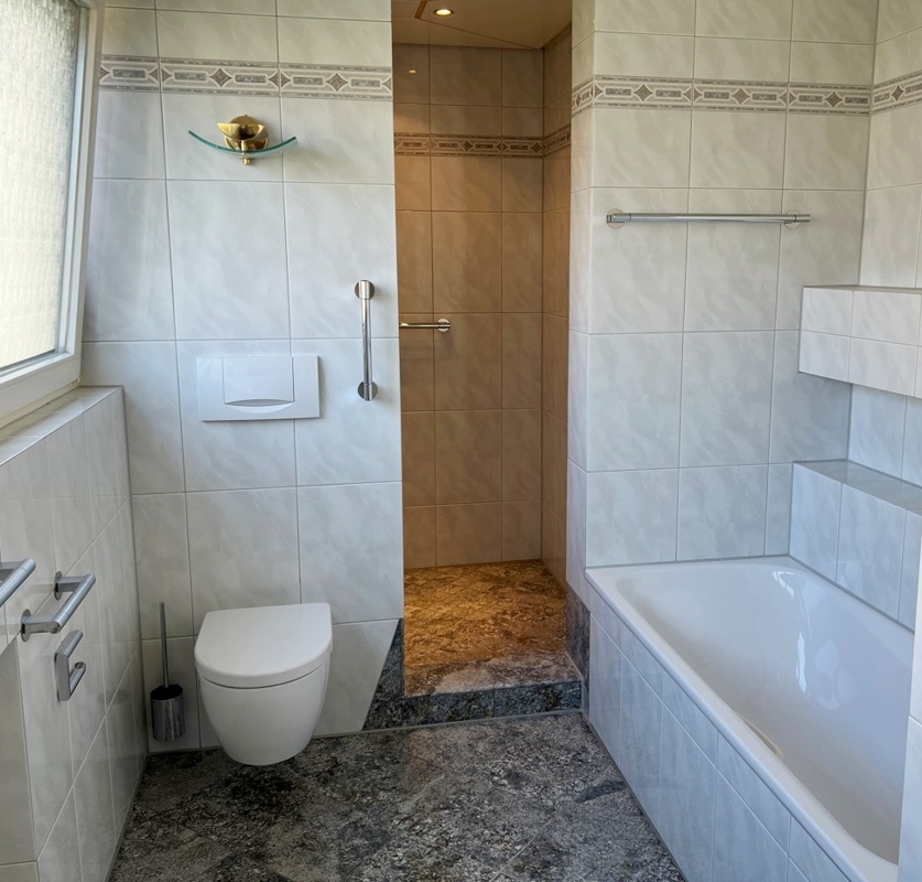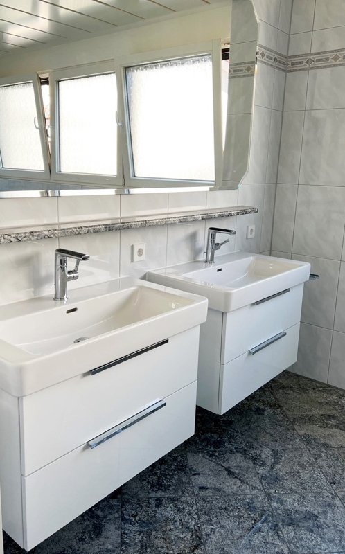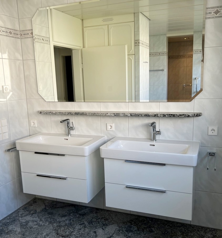 + Bad mit Doppel-Waschtisch mit Unterbauschrank, großem Spiegel, Badewanne, bodentiefer Dusche und WC sowie Einbauschrank