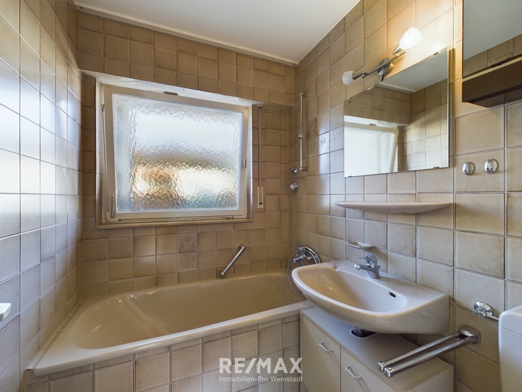 * Bad mit Badewanne, integrierte Dusche, Waschbecken und WC *