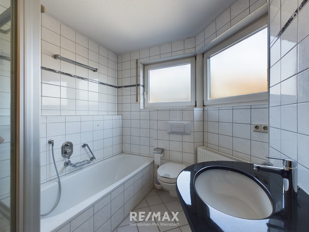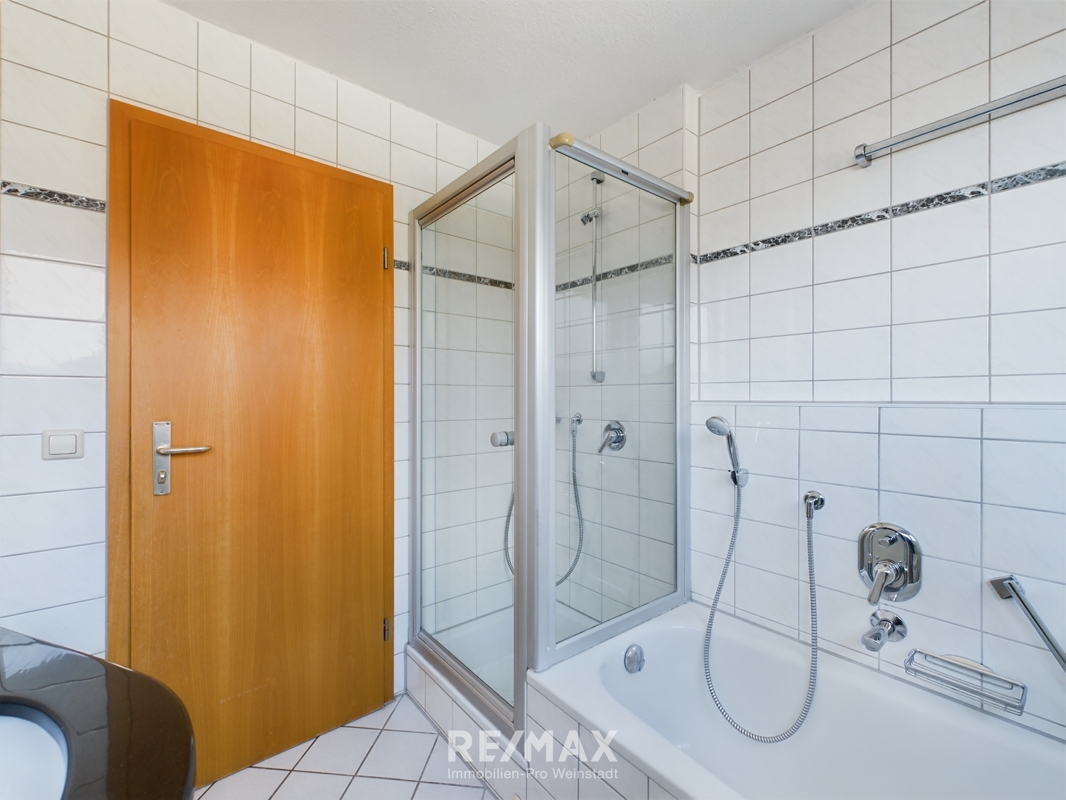 Badezimmer: ca. 5 qm mit Badewanne, separate Dusche und WC, Fliesenboden