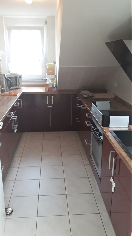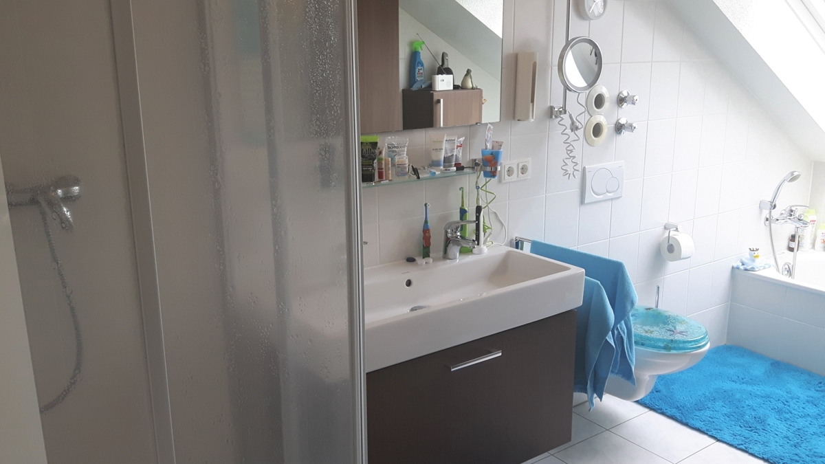 Schöne 4,5-Zimmer Wohnung im Dachgeschoss eines gepflegten 3-Familienhauses in Weinstadt-Beutelsbach.Die Böden der Wohn-Ess- und Schlafzimmer sind mit Laminat ausgestattet. Die Küche (EBK kann für € 1.500,- übernommen werden), das Tageslichtbad mit Wanne, Dusche, 2 Waschbecken und WC und das separate Gäste-WC sind weiß gefliest.