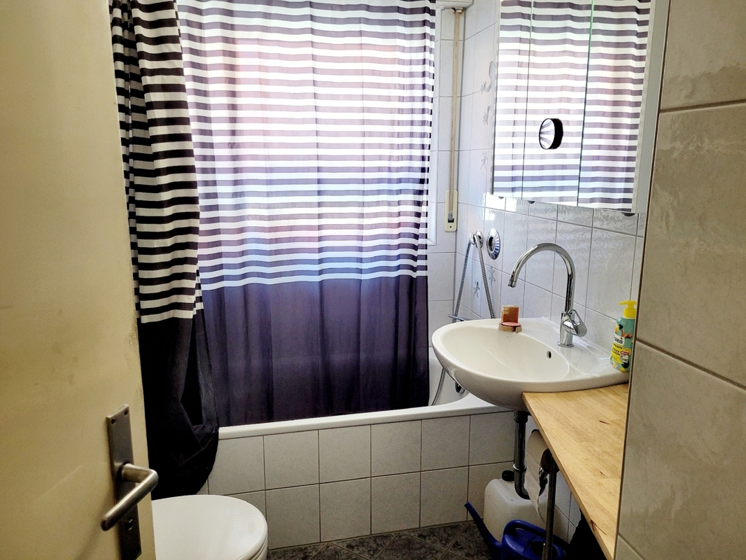 Das Tageslichtbad hat eine Wanne mit Duschvorhang, ein WC und ein Waschbecken.