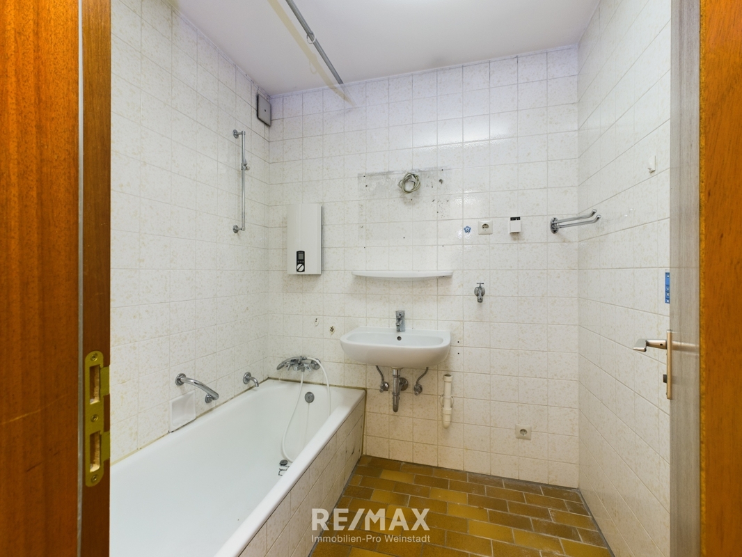 -- Innenliegendes Bad mit Wanne, Waschbecken und Waschmaschinenanschluß. (Renovierungsbedürftig)