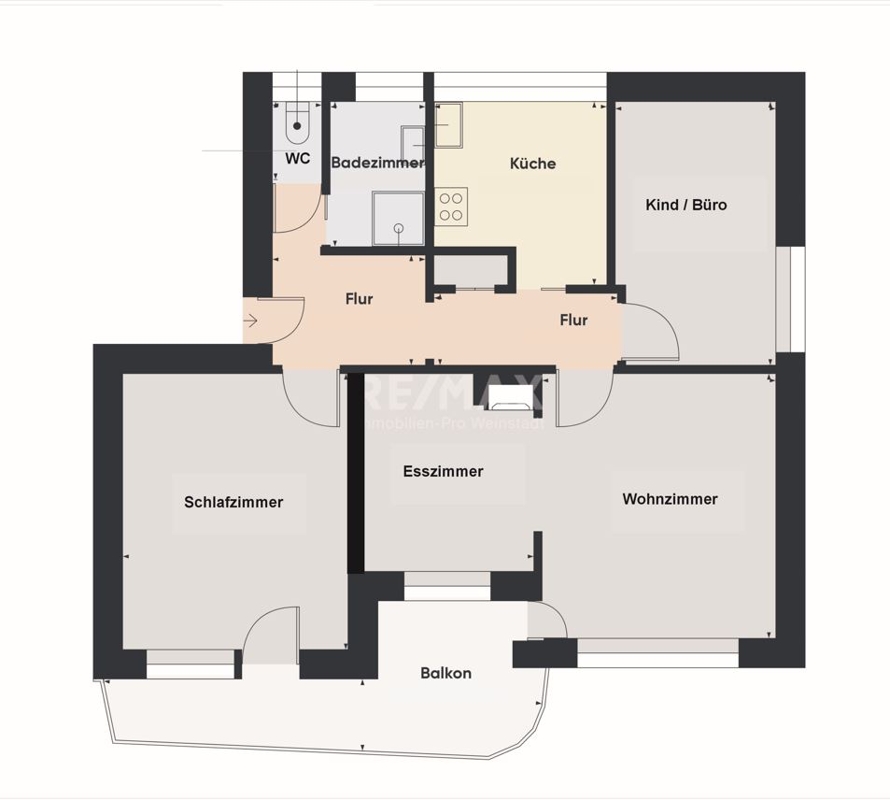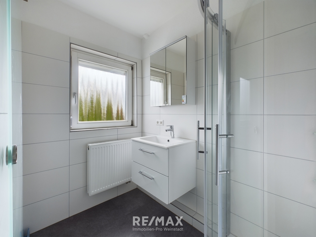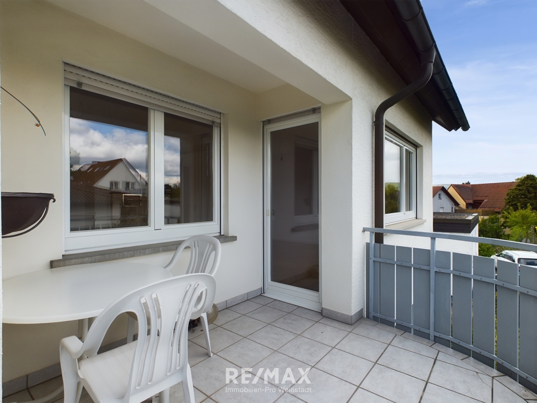 Vom Wohn-Esszimmer gelangt man auf den Balkon. Die Küche ist mit einer Einbauküche ausgestattet. Das Tageslichtbad hat eine Dusche und ein Waschbecken. Das WC ist separat.