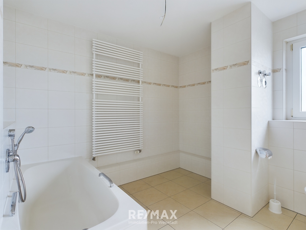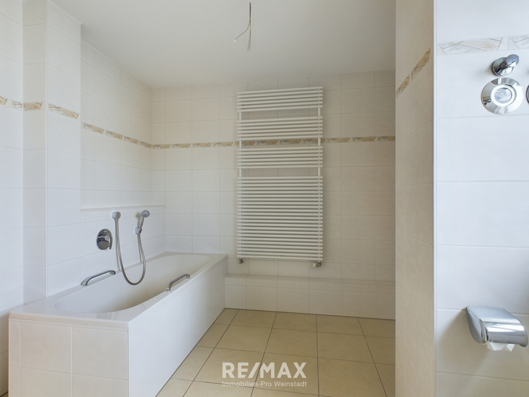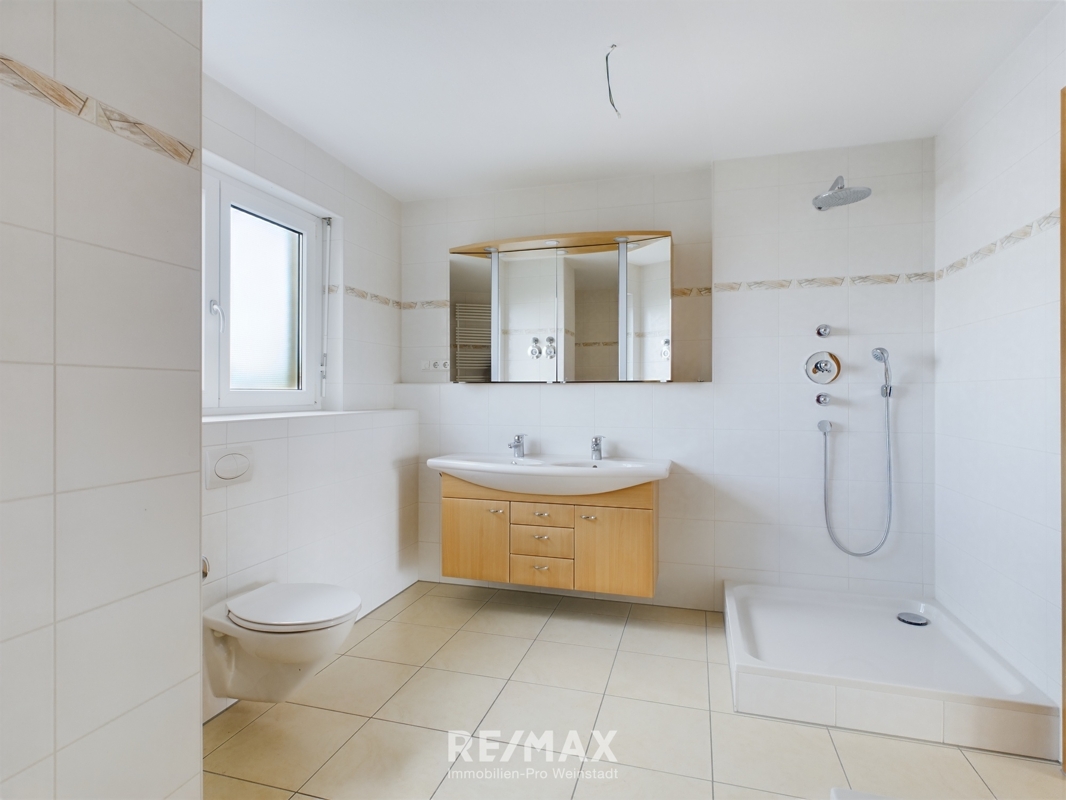 Das Tageslichtbad hat eine Wanne, Dusche mit Duschkabine, 2 Waschbecken, WC und Waschmaschinen- und Trockneranschluß. Ein Gäste-WC steht ebenfalls zur Verfügung.