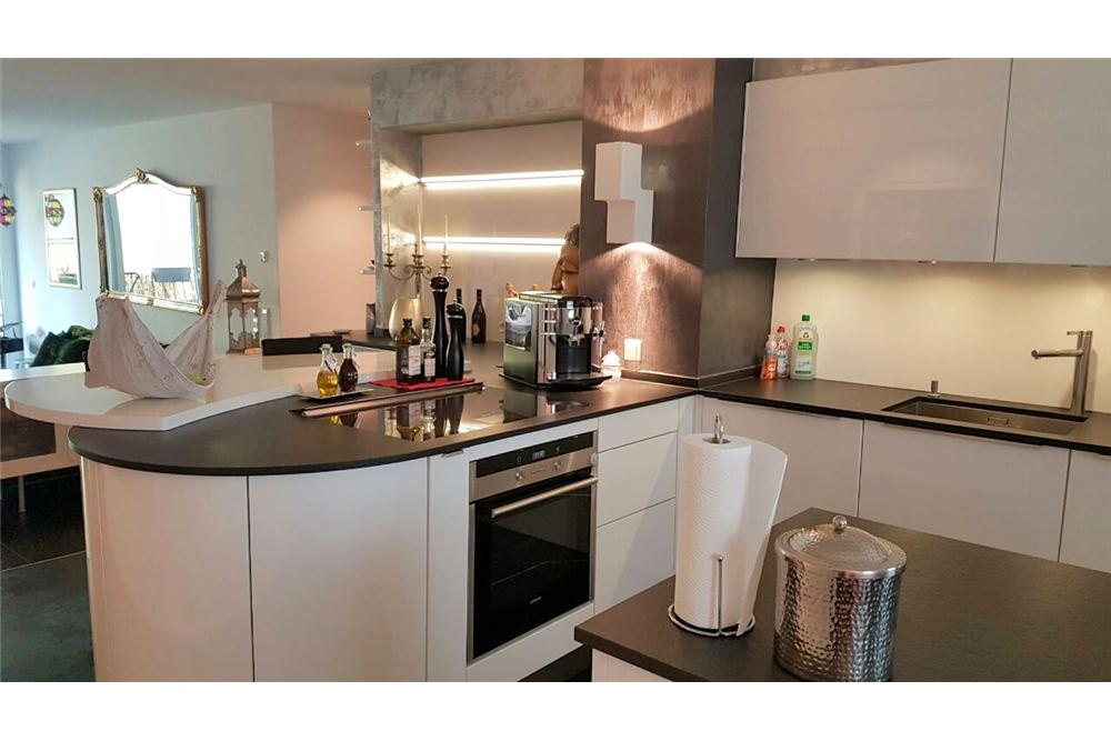 Wohnen, Kochen, Leben, die offene Wohnküche verbindet alle Bereiche des Zusammenlebens. Hervorragend ausgestattet mit Bar, Weinkühlschrank, Spülmaschine, Backofen mit Induktionsherd, sowie Waschmaschine und Trockner bietet die moderne und hochwertige Einbauküche der Fa. Häcker alles was das Herz begehrt. Der Küchenbereich und das in den Boden eingelegte Duschbad mit Toilette und Bidet wurden mit edlem Lavastein gefliest. Vier der Innentüren wurden speziell als Schiebetüren gefertigt, lediglich zur Abstellkammer findet eine ganz normale Anschlagtüre Verwendung.