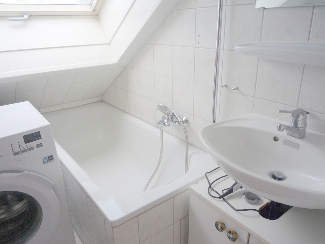 - weiß gefliestes TL-Bad mit Badewanne, Waschbecken und Waschmaschinen-Anschluss