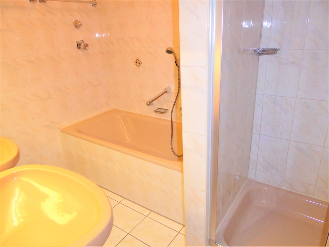 - weiß gefliestes Bad mit Dusche, Badewanne, 2 Waschbecken