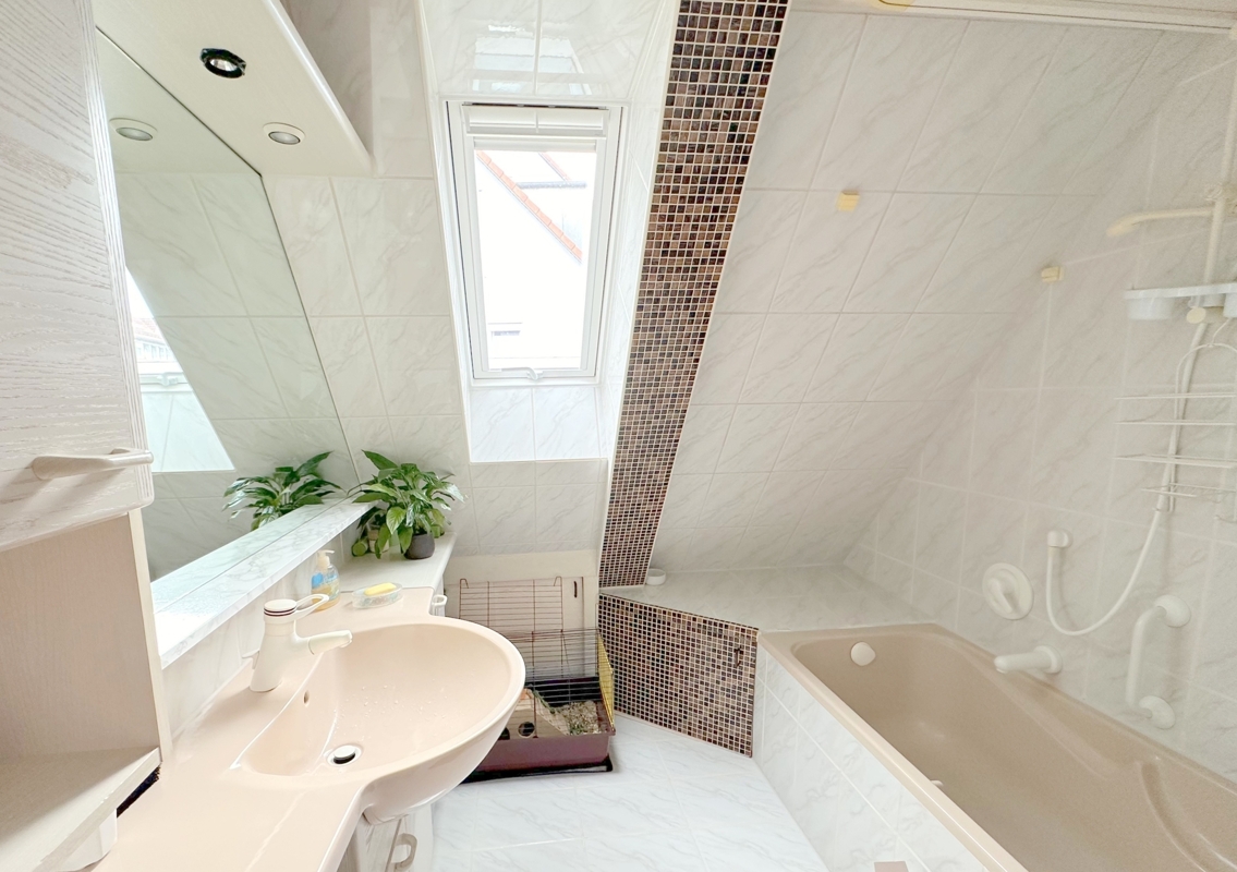 Im Dachgeschoss befinden sich zwei weitere Schlafzimmer, ein Badezimmer, ein Hauswirtschaftsraum und ein gemütlicher Wohnbereich mit Balkon und Blick in den Garten. Alle Räume bieten ausreichend Platz für die ganze Familie. Das renovierte Badezimmer verfügt über eine Badewanne, eine Dusche, ein Waschbecken und ein WC.