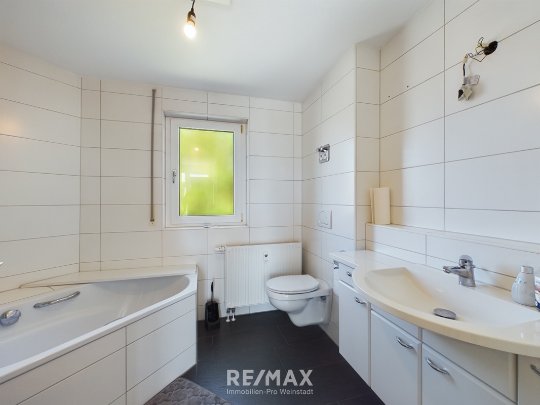 Badezimmer: Das großzügige Bad ist sowohl mit einer Badewanne als auch einer Dusche ausgestattet und bietet somit maximalen Komfort.