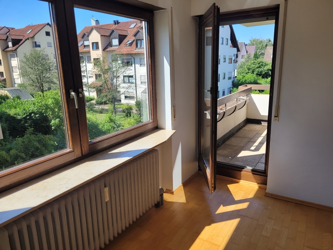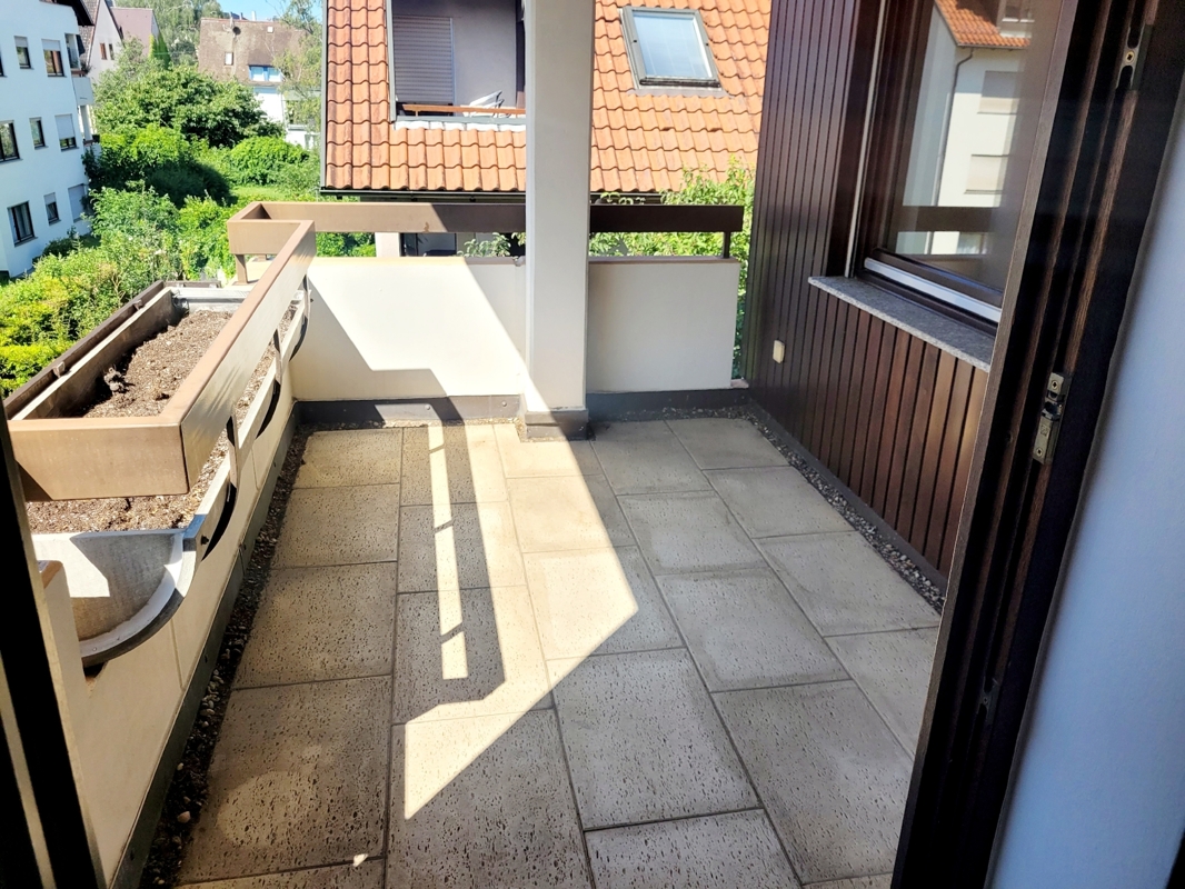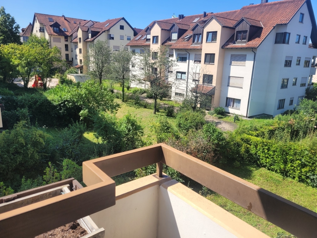 Vom Wohn-Essbereich gelangt man auf den überdachten Süd-West Balkon mit Blick ins Grüne.