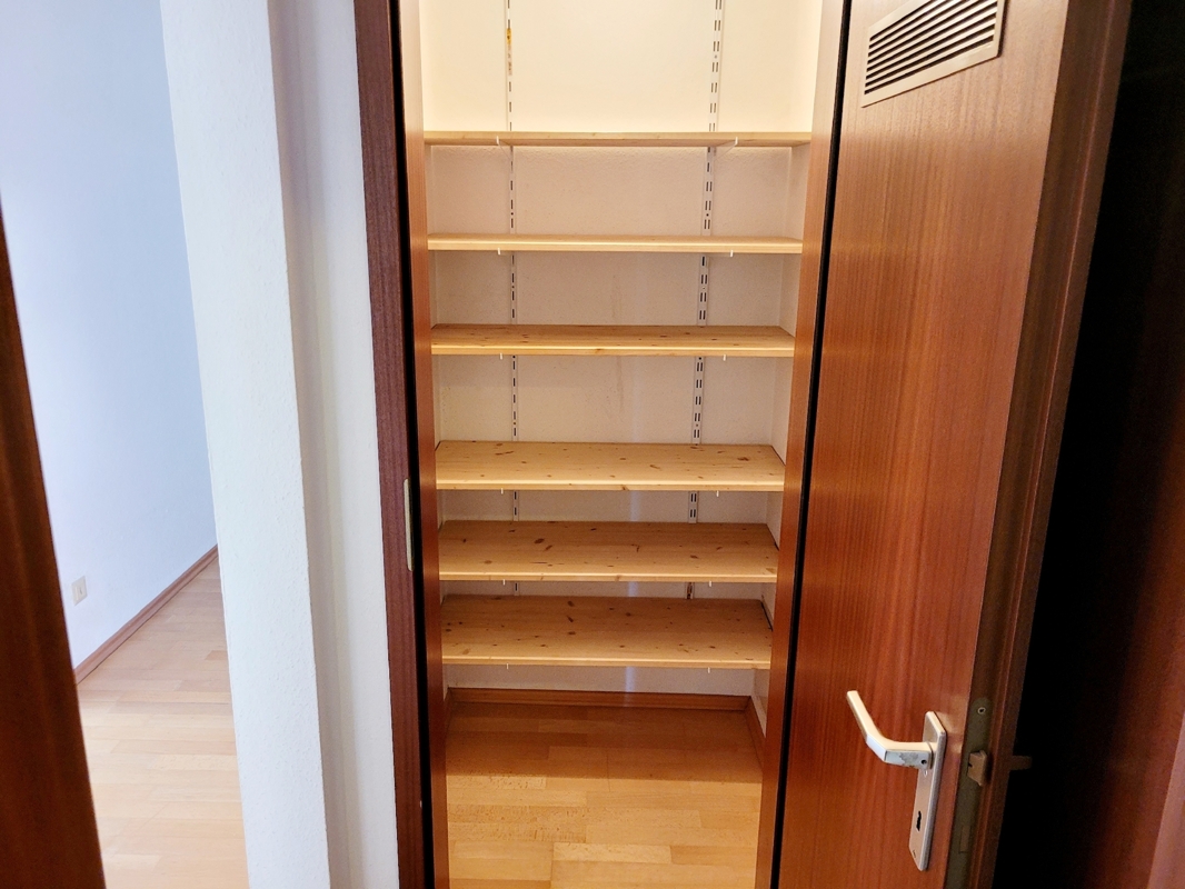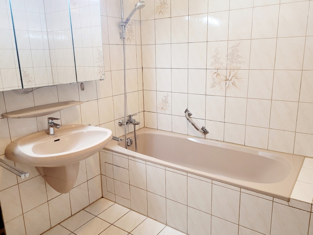 Das innenliegende Bad ist mit einer Wanne, Waschbecken, Spiegelschrank und Beistellschrank ausgestattet. Das WC ist separat. Praktisch ist die zusätzliche Abstellkammer in der Wohnung.