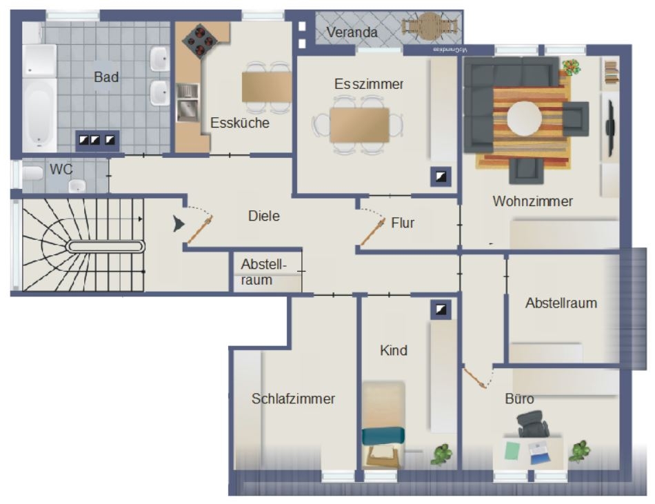 Die Wohnung hat Laminat,- Parket, und Teppichböden. Das Tageslichtbad verfügt über eine Wanne, 2 Waschbecken und einen Waschmaschinenstellplatz. Das WC mit Fenster ist separat. Sehr praktisch ist die gemütliche Essküche. Die 5 zur Verfügung stehenden Räumen können individuell verwendet werden. Die Wohnung hat einen kleinen Balkon. Die Wohnung hat KEINEN Kellerraum aber 2 Abstellräume in der Wohnung.Hinter dem Haus ist die Möglichkeit zum Parken. Aber nur für ein sehr kleines Auto, wegen der engen Zufahrt nach hinten.