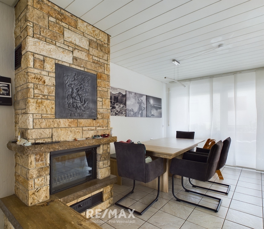 + großzügiger heller Wohnbereich mit Parkettboden+ Essbereich mit schönem Kamin und Zugang zum Balkon