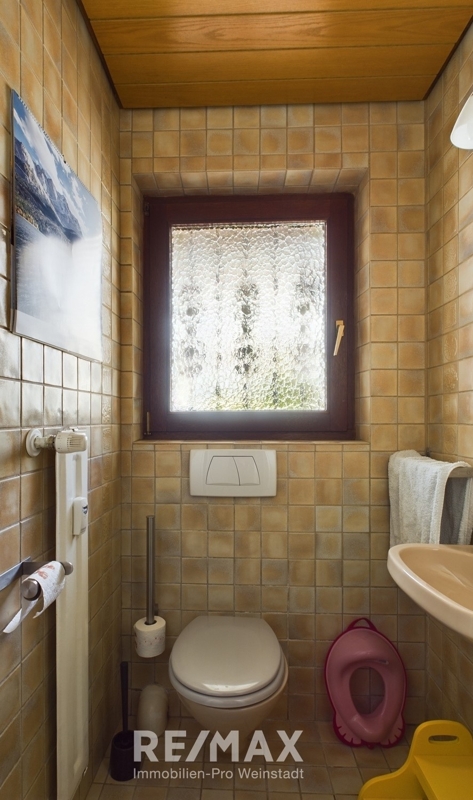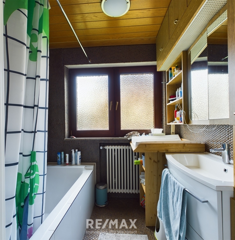 + Tageslichtbad mit Badewanne und Waschbecken.