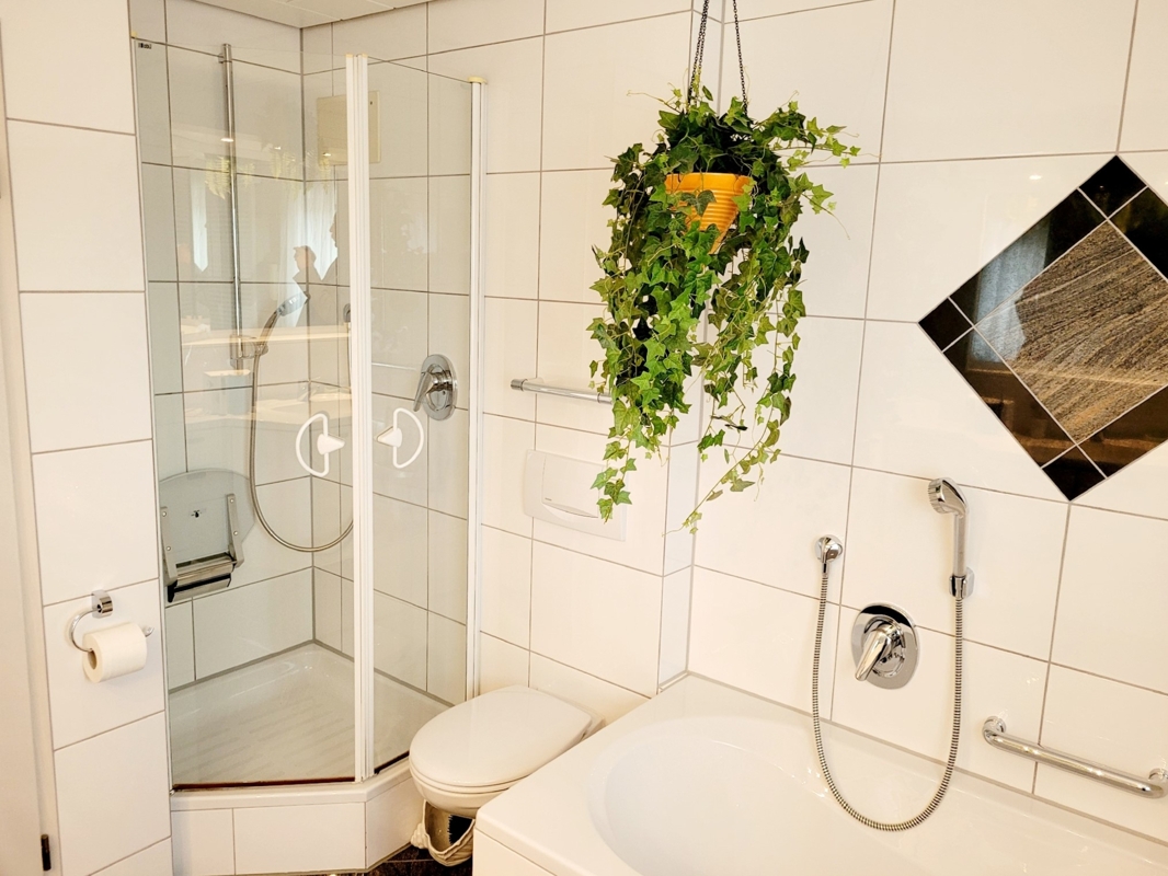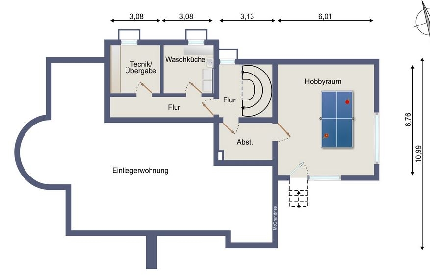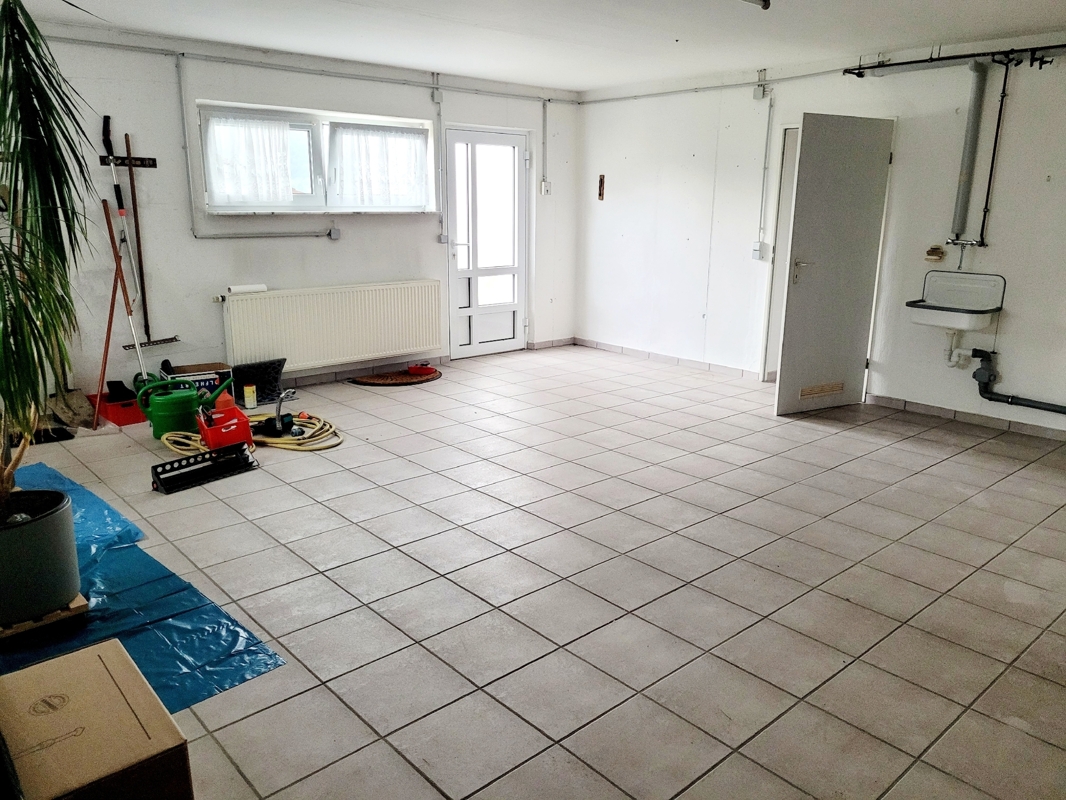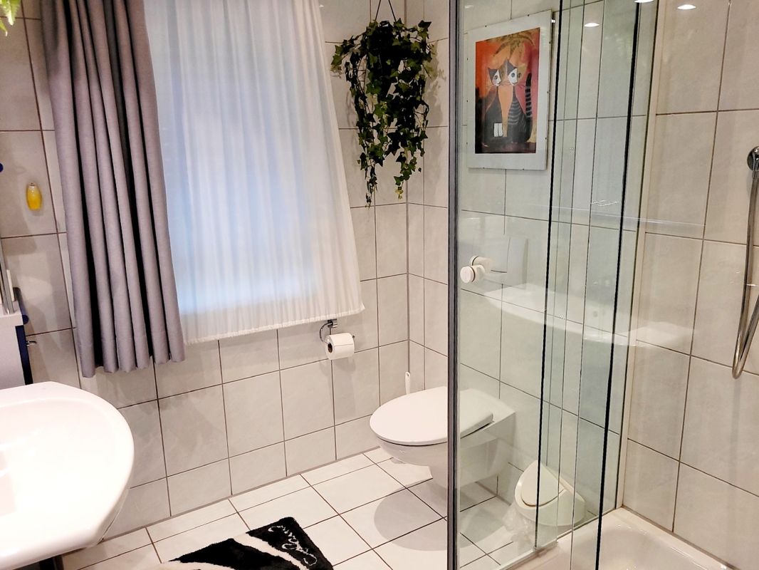 Keller, großer Hobbyraum, Waschmaschinenraum, Heizung (und vermietete Einliegerwohnung (ca.87 m²) mit separatem Eingang).
