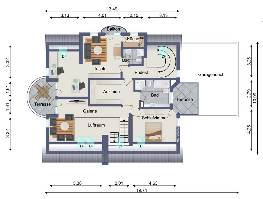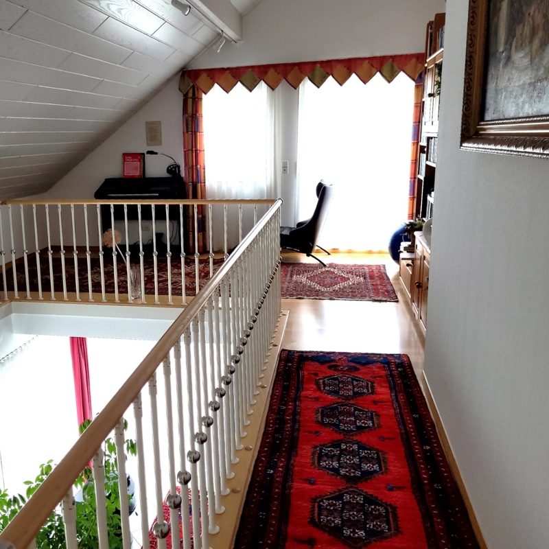 Schlafzimmer, Bad mit Wanne und Dusche, Ankleide-Ecke, Galerie und *kleine Wohnung (für das größere Kind) mit Wohn-Essbereich, Küchenecke mit EBK und Bad mit Dusche und Balkon.