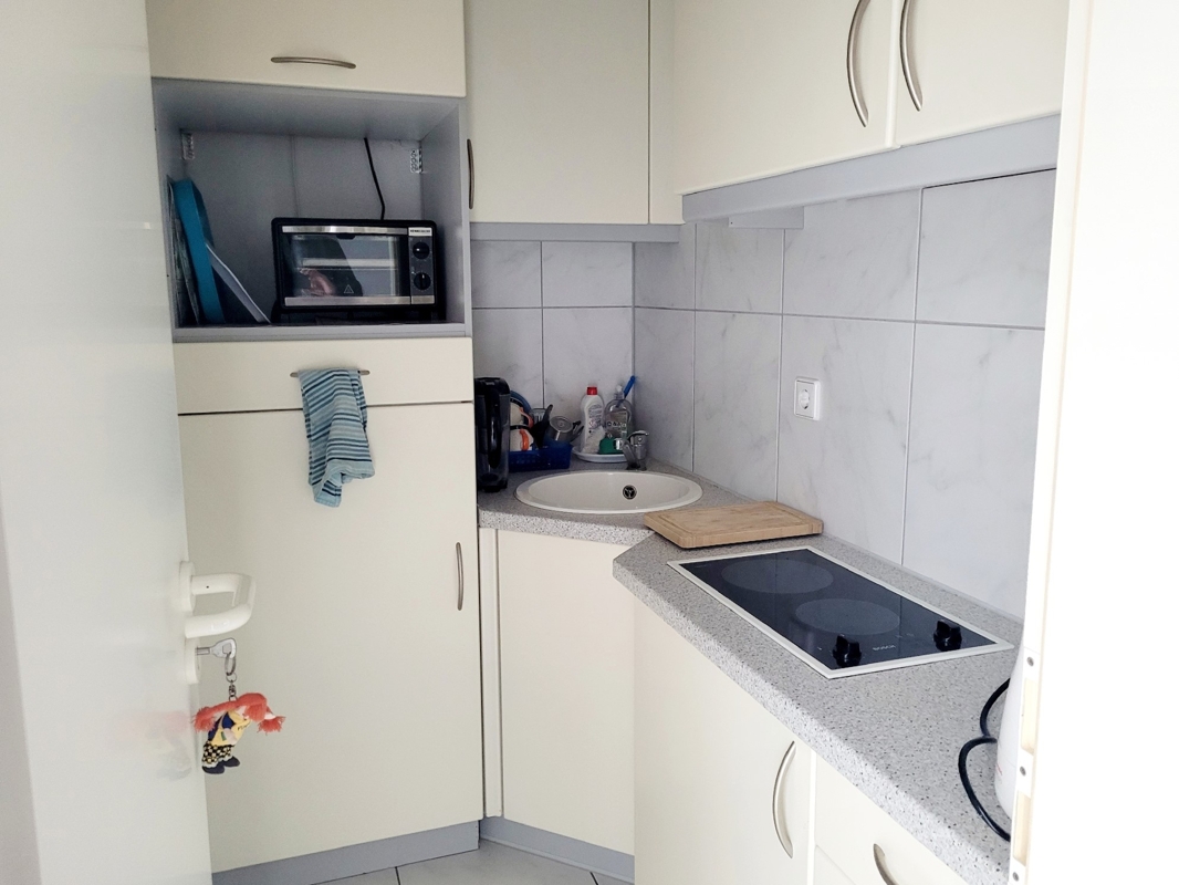 Eingangsbereich, geräumiger Wohn-Essbereich, gefliest, Zugang zum Süd-Balkon, Vorzimmer, Schlaf- bzw. Arbeitszimmer, WC mit Dusche, Küche mit Einbauküche und Vorratsraum und Garage.
