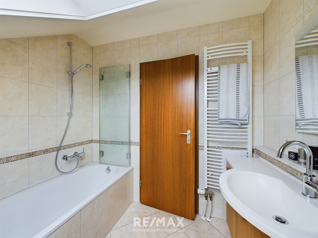Ein elegantes Schlafzimmer und ein stilvolles Badezimmer, das 2006 kernsaniert wurde, runden das Raumangebot ab. Hochwertige Fliesen und ein warmer sowie klimafreundlicher Korkboden im Schlafzimmer verleihen den Böden eine ansprechende Optik.