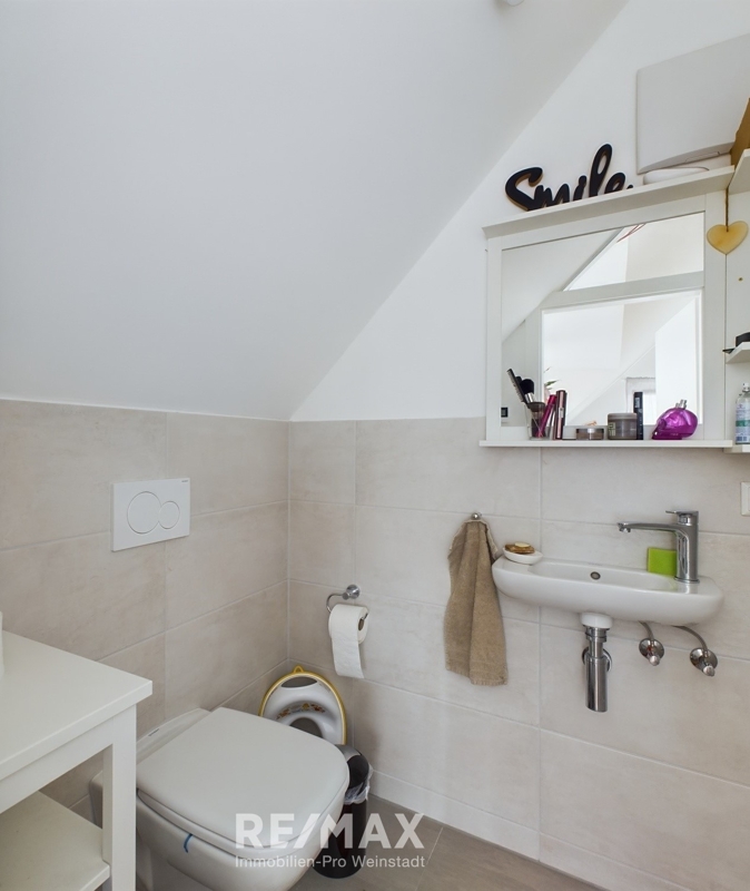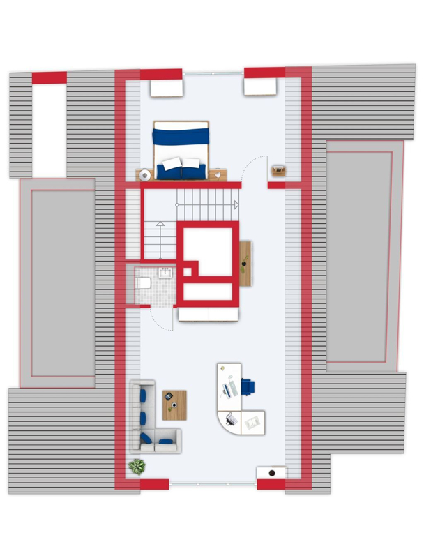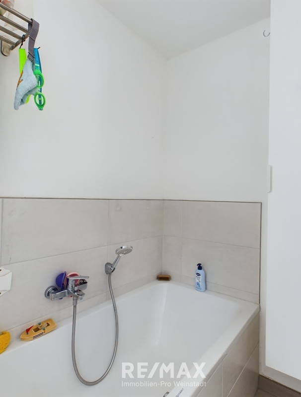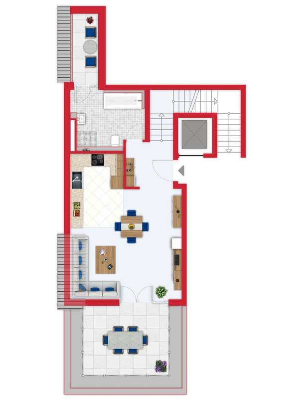 - Bad mit Waschbecken, Badewanne, bodengleicher Dusche und WC sowie Zugang zum weiteren Balkon.