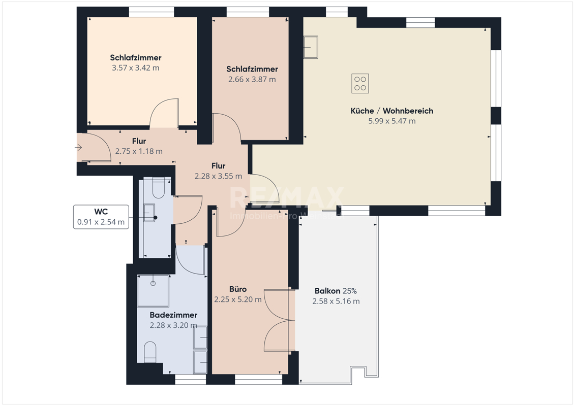 Die Wohnung verfügt über drei geräumige Schlafzimmer sowie ein Tageslichtbad, das mit einer Dusche, einem Waschbecken und einem WC ausgestattet ist. Ein separates Gäste WC ist ebenso vorhanden. In allen Räumen sorgt eine Fußbodenheizung für eine angenehme Wärmeverteilung und ein modernes Wohnambiente.