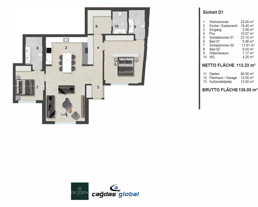 Das 2+1 Apartment D1 mit 113,23 m² besticht durch seinen offenen Wohnbereich, zwei Schlafzimmer und einen weitläufigen Garten (80 m²). Ein Stellplatz (12,5 m²) sorgt für zusätzlichen Komfort. Bruttofläche: 135 m².