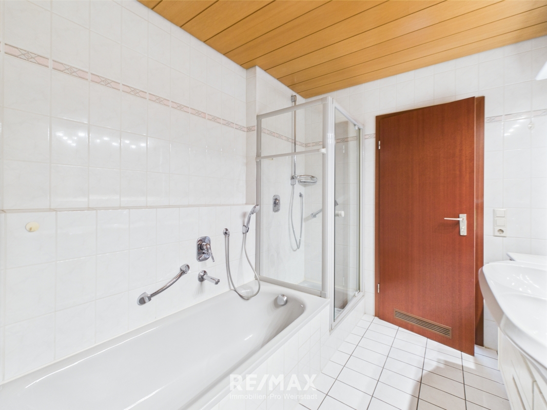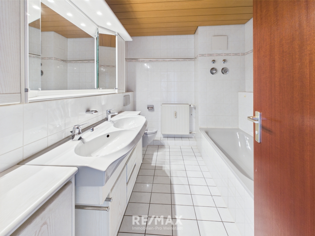 Das innenliegende Bad hat eine Wanne, Dusche, ein WC und ein Doppelwaschbecken.