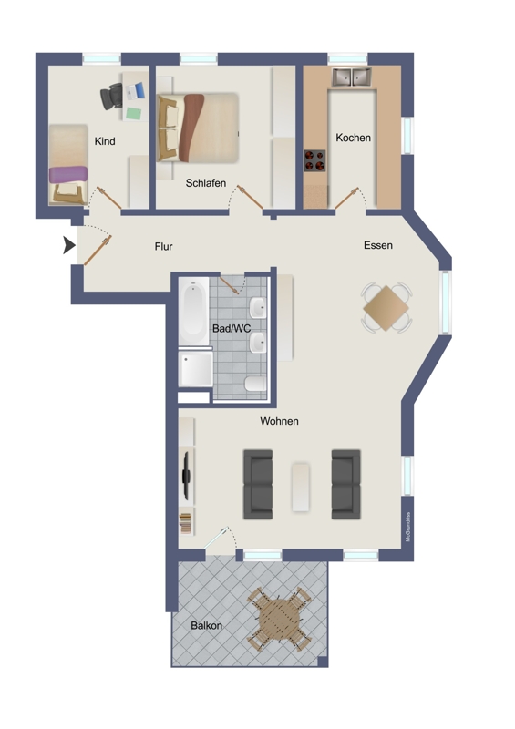 Die Böden im Wohn-Essbereich, Küche und Bad sind gefliest. Die Schlafzimmer und der Flur sind mit Parkettboden ausgestattet.