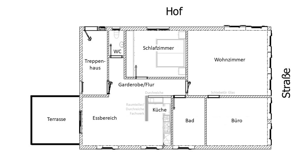 Die Wohnung verfügt über ein Wohnzimmer, ein Schlafzimmer und ein 3.Zimmer, (ein "gefangenes Zimmer"), welches lediglich mit einer Milchglastür vom Wohnzimmer getrennt ist.