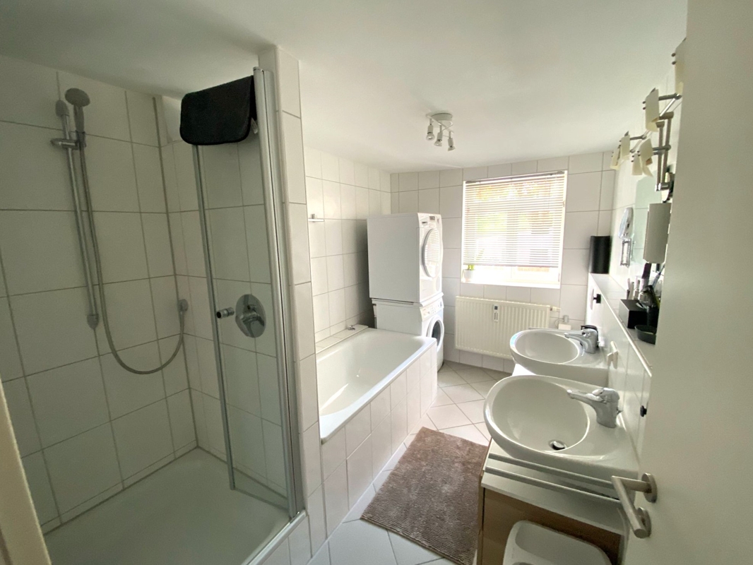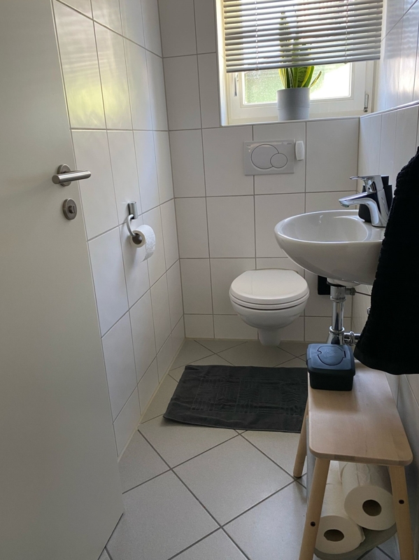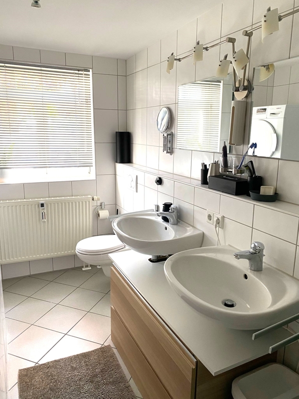 Das Tageslichtbad mit Fussbodenheizung hat eine Wanne, Dusche, WC und bietet Platz für die Waschmaschine und den Trockner. Zusätzlich gibt es noch ein Gäste-WC.