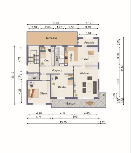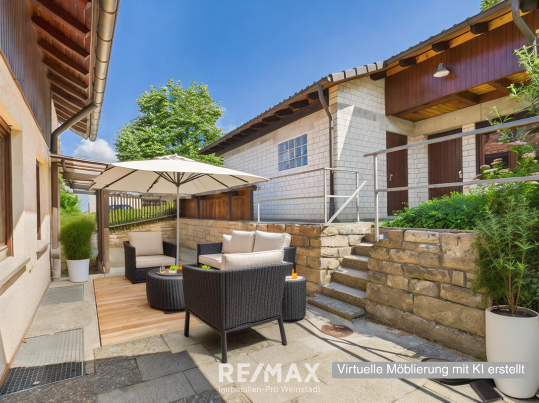Vom Wohn-Essbereich gelangt man auf den geräumigen Balkon mit schöner Aussicht. Ein großzügiger Außenbereich mit Terrasse hinter dem Haus sorgt für entspannte Freizeit.