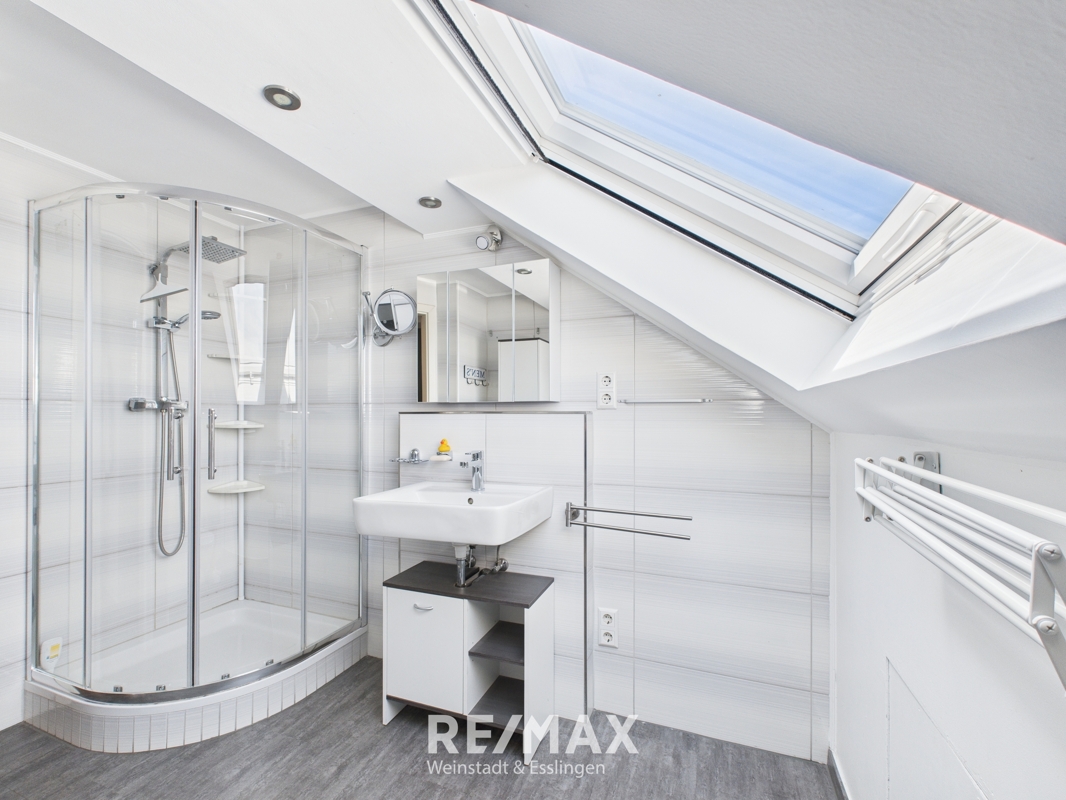 Komfort verspricht auch das Tageslichtbad mit Fußbodenheizung, Dusche und vorbereiteten Anschlüssen für eine Badewanne. Ein heller Flur mit seitlicher Glaseinfassung an der Wohnungstür sorgt für einen freundlichen Empfang. Laminatboden in Holzoptik, eine neue Dachdämmung sowie Fenster mit integrierten Fliegengittern unterstreichen den hohen Wohnwert.