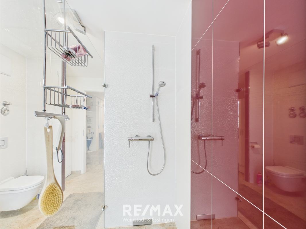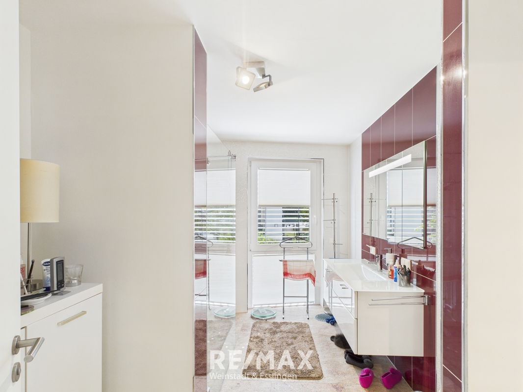 Tageslichtbad mit bodengleicher Dusche, Badewanne und hochwertigen Sanitärobjekten